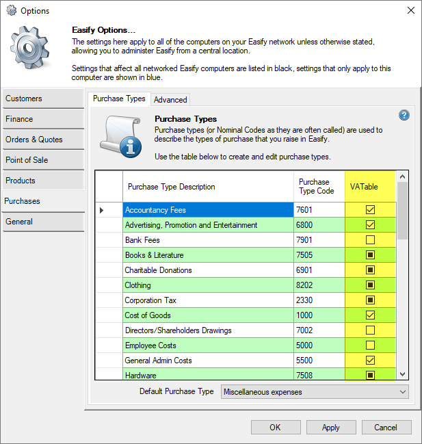 As certain purchase types (sometimes referred to as nominal codes) don’t appear on a VAT return such as wages, pensions, rates, etc you will have to make sure that your purchases types are set to be Vatable or not Vatable.