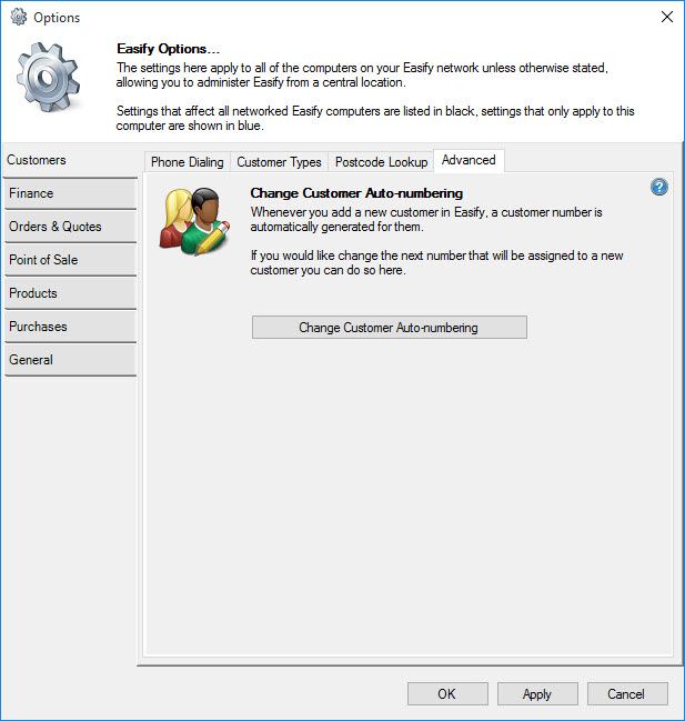 Typically Easify will number your customers starting at number 1. However if you would rather commence numbering from another number click the Change Customer Auto-numbering button.