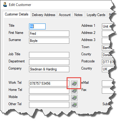 The phone dialler feature can be accessed via the customer details Window. Simply bring up a customers details from the main customers Window, and click the phone button alongside the phone number to be dialled.