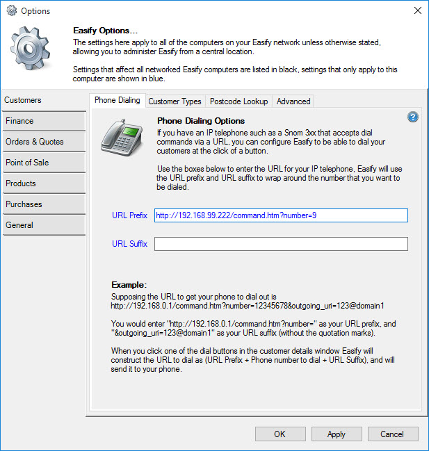 The first is the URL Prefix where you would enter the URL of your telephone. As you can see in this example the IP address of the telephone is 192.168.99.222. We have followed the IP address with the command that is specific to the type of phone being used (in this example a Snom 320). The command for the Snom 320 is 'command.htm?number='. You will notice that we have appended a '9' to the end of the URL Prefix, this is because we need to dial 9 for an outside line and since Easify appends the number to be dialled to the URL Prefix, this ensures that we automatically dial 9 for an outside line.