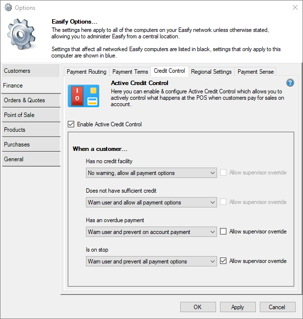 NOTE: Easify has a certain level of credit control built in and enabled as standard e.g. customer payment terms, credit limit, aged debtors reporting etc... Active Credit Control allows you to take this a step further and have Easify intervene if a customer is beyond their credit arrangement with you at the Point of Sale.
