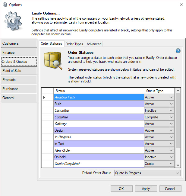 Order status can be used when working with orders and quotes in Easify to help you determine at what stage an order or quote is at.