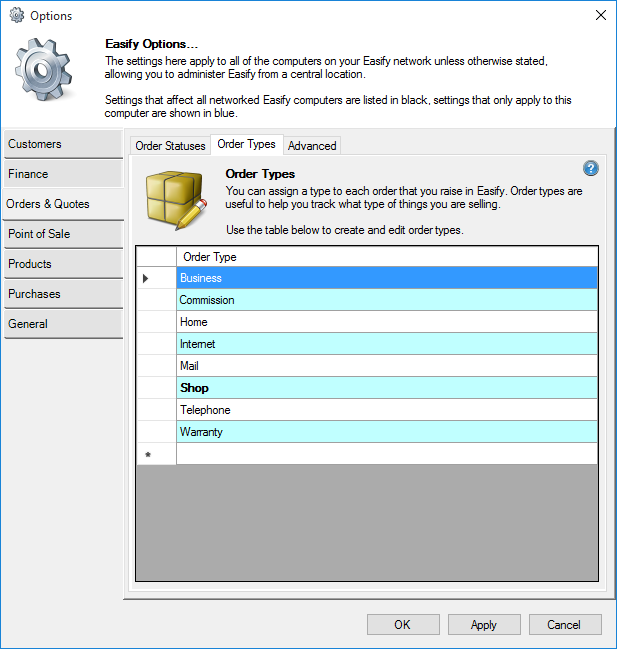 We have created a list of order types that will suit many businesses, but the odds are that you will wish to customise the list of order types to exactly suit your business model.