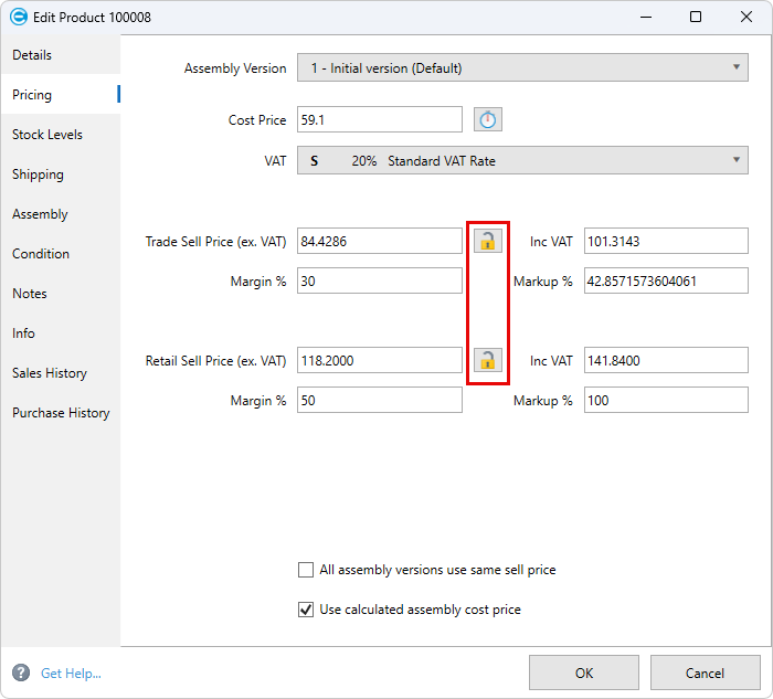 You can also override the default pricing option on a per product basis. In the Product Editor on the Pricing tab you can click on the padlocks shown below to choose a fixed sell price or a fixed margin. This option applies to both the trade pricing and the retail pricing so setting it for one will also set it for the other.