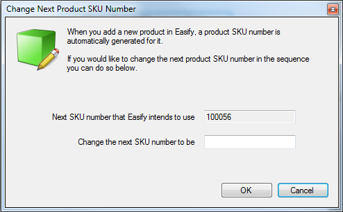 To change this number simply enter your preferred next SKU number in the box below and click OK.