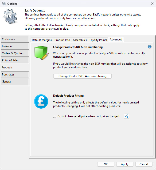 On the advanced options page you can change the auto-numbering of products within Easify, and also the way that product prices are handled on the Pricing tab of the Product Editor.