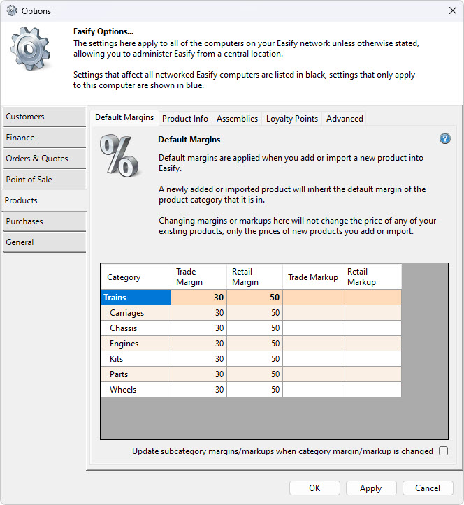 Easify allows you to record default margins for each category and subcategory of product that you keep.