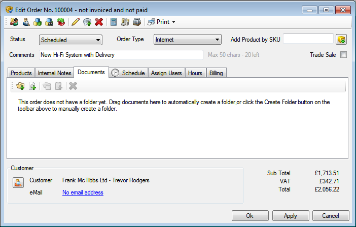 Here you can see the order Documents tab, and as this order does not have any documents associated with it you see a message telling you that you can manually create a folder for this order, or simply drag documents onto the panel to create a folder and copy the documents there.