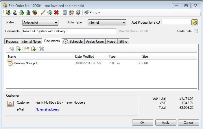 As you can see the delivery note now appears in the Documents tab of the order. From here you can double click it to open it, and if you configured the DMS to use a network shared folder, any other networked Easify users will also be able to access the delivery note.