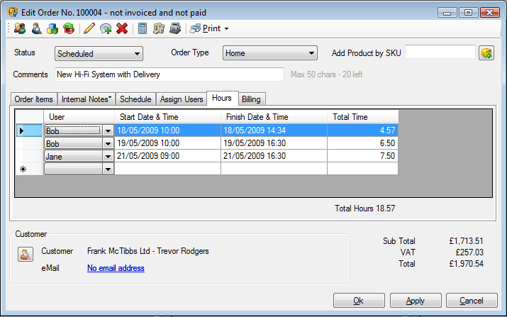 Easify will totalise the hours as you go, making it a simple job to read off the total when you come to bill for the time spent on the order. It's then a simple case to add a labour product to the order, and set the quantity of the product to the number of hours indicated on the hours tab page.