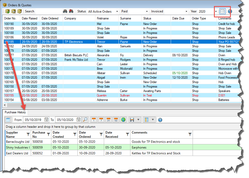 The Orders Purchase History displays a list of all of the purchases that have been placed for goods required for the selected Order, and with Live Reporting you can and sort and filter the results in a variety of different ways.
