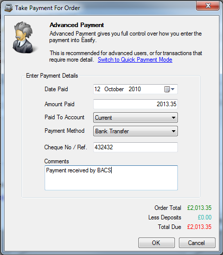 Here you can fine tune the details of the payment. You can set the payment date, the amount paid, which account the money is to be paid to, what the payment method is, as well as entering a reference number and comments related to the transaction.
