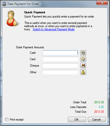 Simply enter the amount of the payment in the relevant payment method box, and click OK when done.