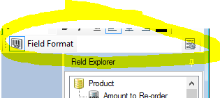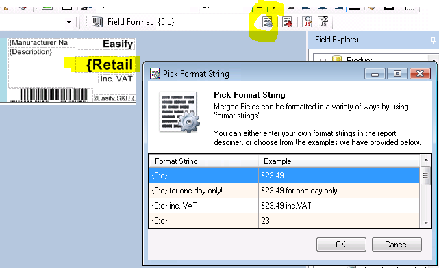 The Field Format area of the toolbar consists of two parts, a text box where you can type in format strings, and a Pick field format button that pops up a format string picker that allows you to choose from pre-defined format strings.