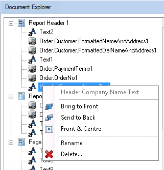 As well as being able to position and resize document elements such as pictures and text fields within the document designer, you can also right click document elements to bring up a context menu that allows you to move the item on top or behind other items, you can also rename and delete document elements. See the later sections Field Explorer and Document Explorer for more information about the context menu as used for editing document elements.