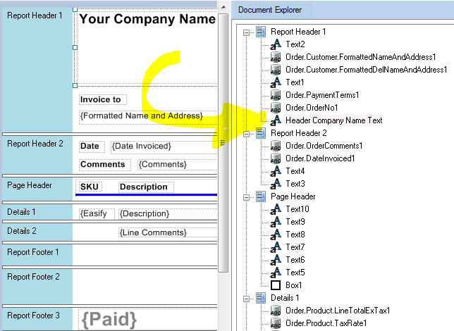 Selecting a document element in the Document Designer will select it in the Document Explorer.