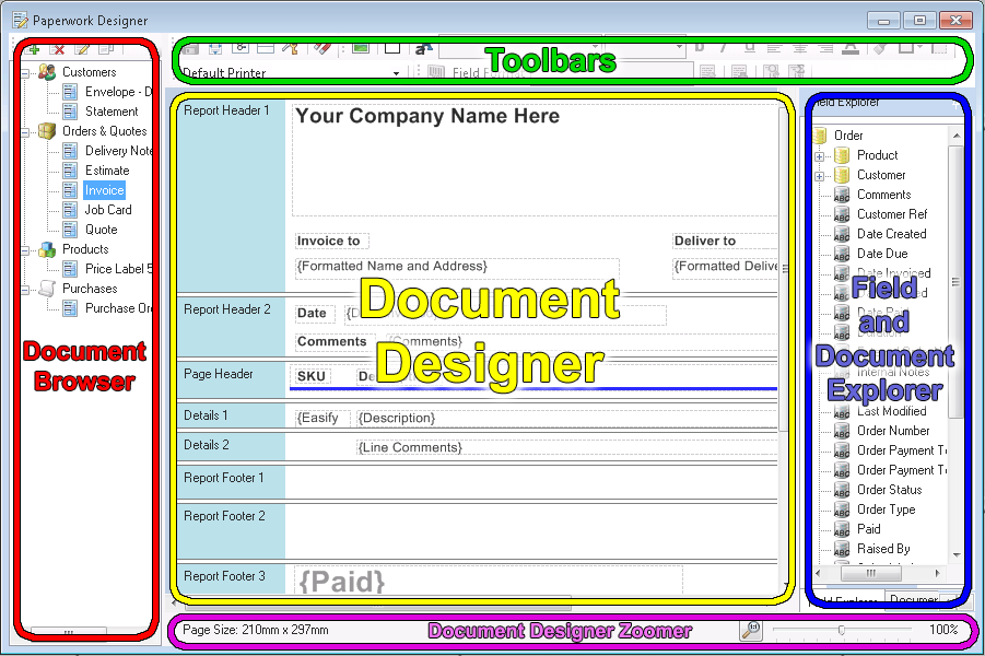 The Paperwork Designer features an intuitive WYSIWYG (What You See Is What You Get) interface that allows you to simply drag and drop the various elements that will make up your document (Pictures, Text, Lines and Data) onto your document.