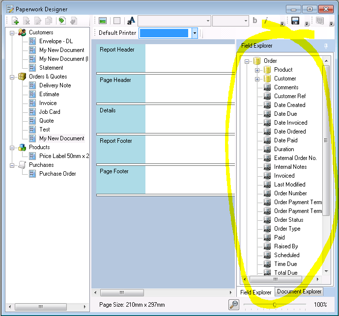 All of the items (Mergefields as they are known) that you see in the Field Explorer can be dragged onto your document, and when the document is printed the Mergefields will be replaced by the data that they represent.