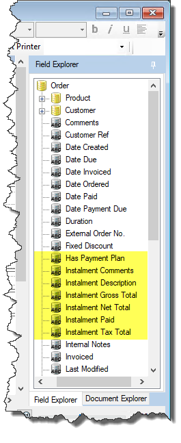 When you are working on an Orders & Quotes document the Mergefields in the Field Explorer will reflect the kind of data that is relevant to Orders & Quotes.