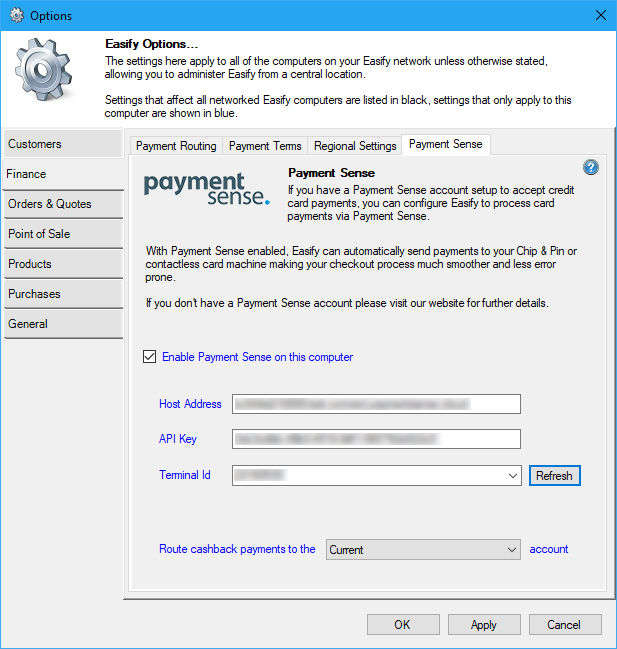 NOTE: To use Payment Sense with Easify you need to be running Easify V4.44 or later.