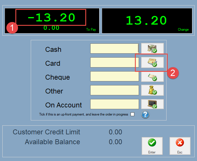 Here we want to refund the full amount to the customers card, in which case you simply press the button to the right of the card amount box as outlined in red above 2 .