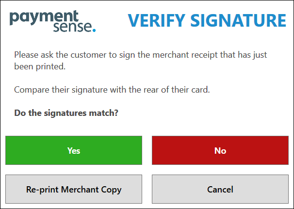 Now you should get the customer to sign the merchant receipt and check that their signature matches the signature on the back of their card.