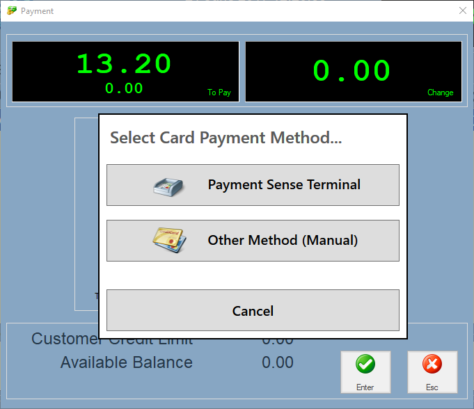 To take payment using the Payment Sense card terminal click the Payment Sense Terminal button.