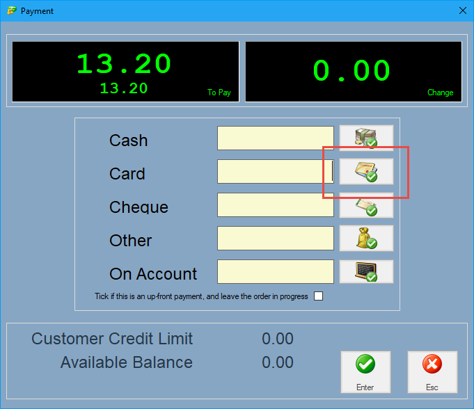 Typically you will want to take full payment by card, in which case you simply press the button to the right of the card amount box as outlined in red above.