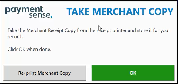 A message will popup telling you to keep the receipt for your records, and you will also have the opportunity to re-print the merchant receipt if you need to, e.g. if your receipt printer ran out of paper half way through printing.