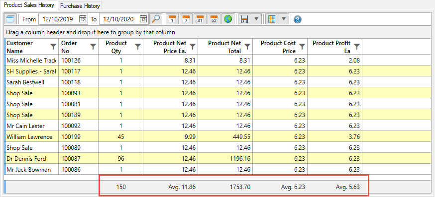 So you would select Product No 100012 in the Main Products window and then select last year as the date range in the History pane.