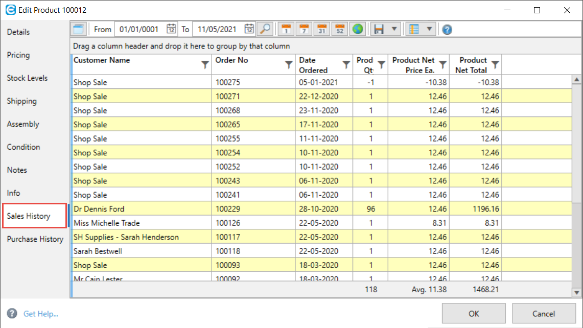 For instance you might want to see The Sales History for Product No 100012 during the last year, to ascertain whether it is still worth stocking this item.