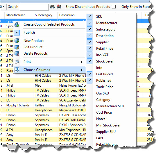 On the toolbar at the top of the Products window are a series of buttons that provide easy access to the main functions of the products page, there is a check box named Show Discontinued Products which when ticked, will display discontinued products in the products list as well as current products. Discontinued products are always displayed in the product list as greyed out with a line struck through them.