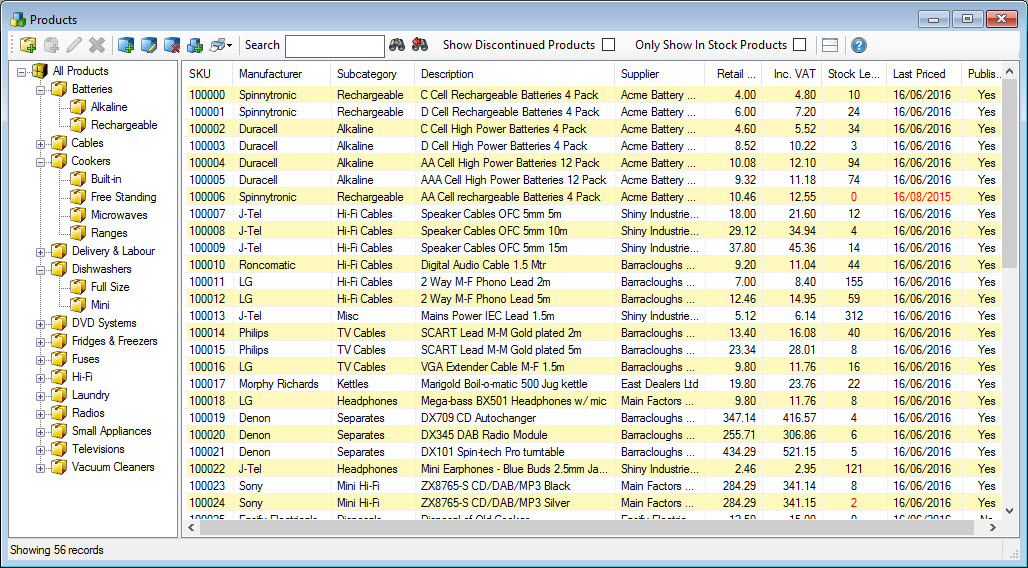 Colour coding is used in several areas of the product list. If a product is on or below a minimum stock level it will appear in red. If the price of a product was last checked (modified) more than 30 days ago, then the date in the Last Priced column will turn red to warn you that the price may be out of date.
