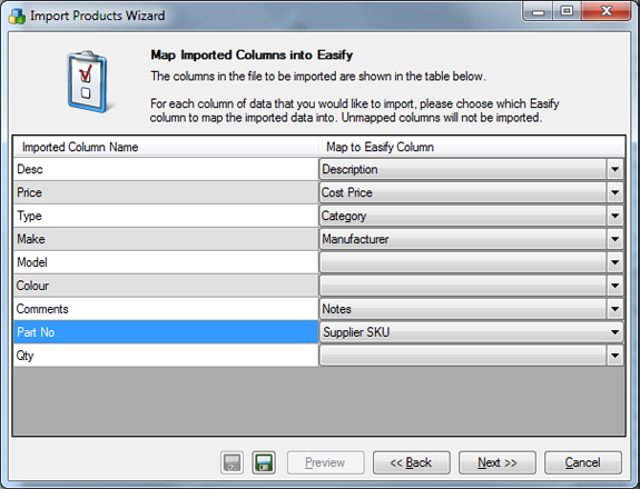 NOTE: There may be instances where you have more columns in the import file than there are available in Easify. In this case Easify will allow you to map multiple import columns to a single Easify column, as long as the Easify column chosen is either Description or Notes. For example, you could choose to map the columns Desc, Model & Colour in the imported file to the single Easify column description. The description column in Easify would then contain the Desc, model and colour from the import file, each separated by a space.