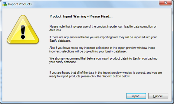We also recommend that you backup Easify via the Tools->Backup menu prior to importing product data. That way if you have made an error in setting up the importer you can restore your database to a point in time prior to the import.