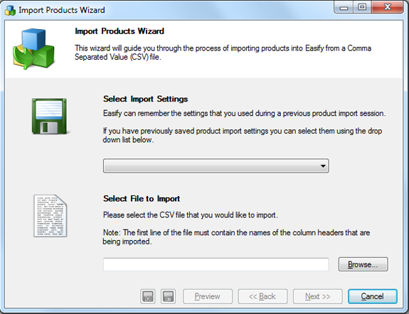 Here you must choose the file that you wish to import products from. This must be a CSV or TAB file. Click the browse button to browse for the file that you wish to import.