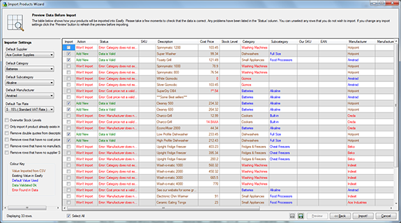 Take some time to review the data that you are being shown in the preview. De-select any rows that you are not happy with and make sure that the data looks correct. It is quite easy for errors to creep into import data files (suppliers have been known to make typos), and while Easify does its best to warn and protect you from errors, there is no substitute for the MkI Human Eyeball in ensuring that your data is correct. After all Easify cannot know if a product description is misspelled or has been under priced.