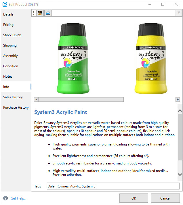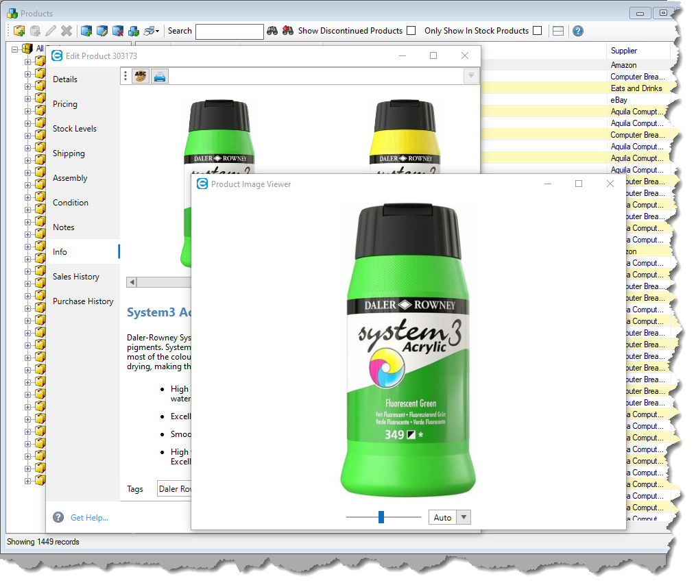 The product info is also useful even if you don't use eCommerce as it allows you to store product images and detailed descriptions that you can easily access from within Easify Pro, and it also allows you to print out the info so that (for example) you can give it to your customers as a handout.