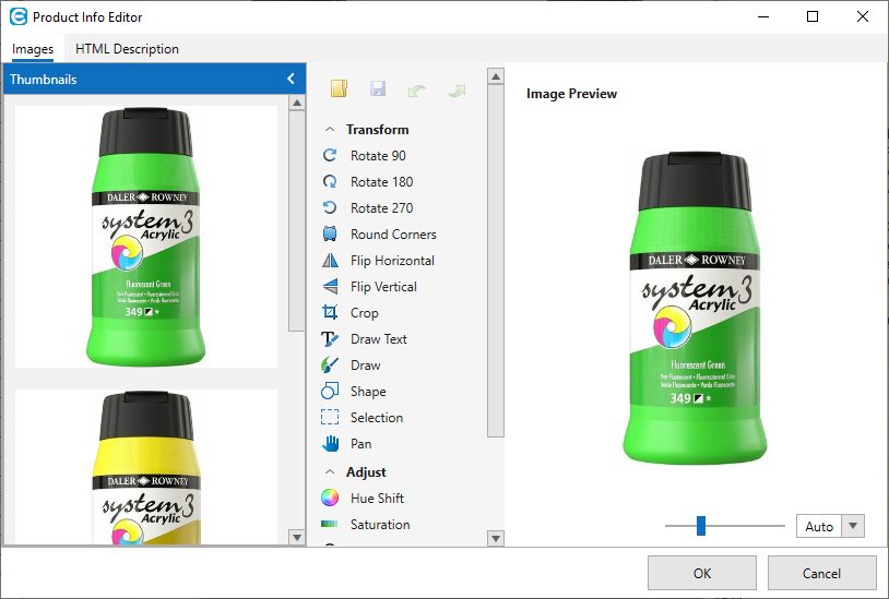 This will open the Product Info Editor where you will be able to add, edit and delete product images, as well as edit the product HTML Description.