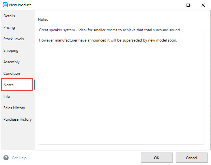 Whether you want to keep handy sales tips about the product, or purchasing details and comments, the notes tab is a handy central location for the information.