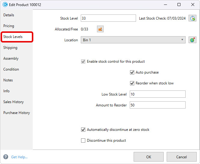 Auto purchase: Tick this box if you want the product to be auto purchased on any orders where it is required but is not in free stock.