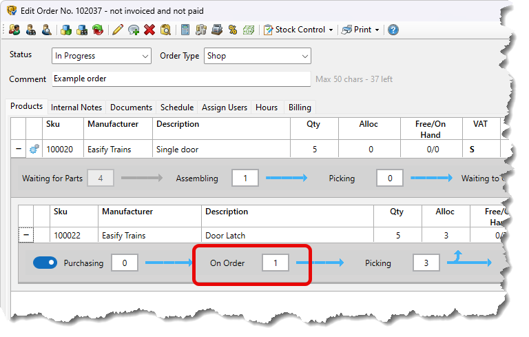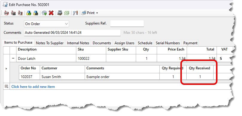 When you save changes to the On Order Purchase, note that when you open the order it now shows that the item is On Order 1.