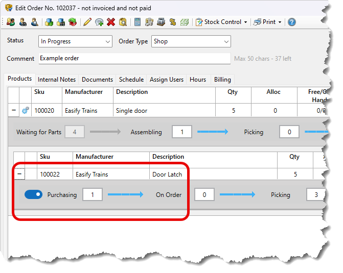 Click here to learn more about enabling auto purchasing.If you have an item of Quantity 1 on an order that is not in stock and Auto Purchase is enabled, the item will show on the order as Purchasing 1.