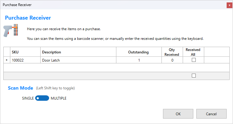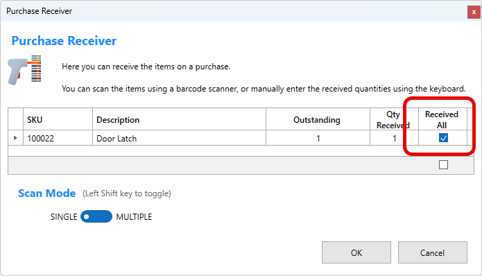 Here you can scan each item that has arrived using a barcode scanner which will record that it has been received. Or just simply enter the Qty Received manually using the keyboard or tick the Received All checkbox.