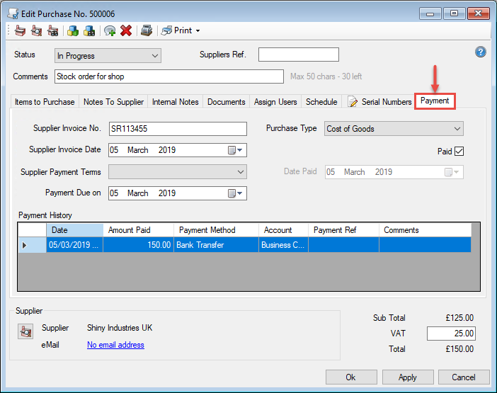 The payment tab also features a handy Payment History section where you can easily view any payments or refunds that have been made in relation to the purchase. Double click any payment record in order to view or edit its details.