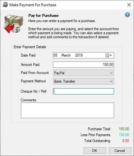 Here you can set the date that the payment was made, the amount paid, which account you paid for the purchase from and the payment method. You can also record a reference number along with any comments related to the payment.