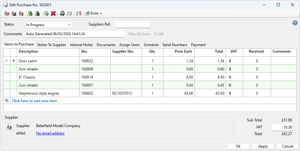 Enter the items to be purchased by dragging them onto the Purchase from the main Products window. Easify will then automatically pull in the details for the product.