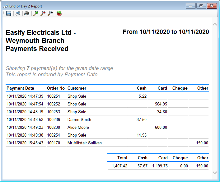 The End of Day Z Report allows you to run off a report to see all the payments you have taken in that day. It combines payments from all Tills and PCs for that company.