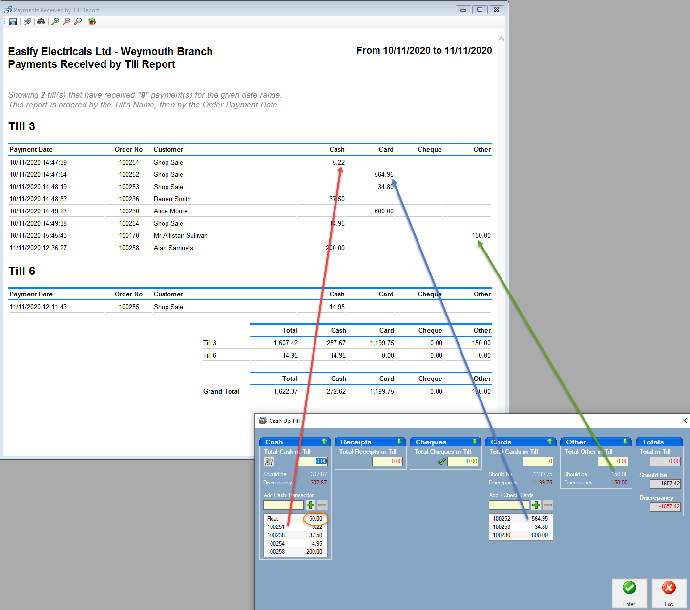 Also If you have entered a Float (highlighted in orange) this will show in your cash totals on the cashing up screen, but it won't show on the Payments Received Reports as it's not a payment. It is a transfer from the cashbox account (or similar depending on your settings) to the till. It is included in your cash figures on the cashing up screen as the cashing up screen is merely telling you how much cash you should have in that till.