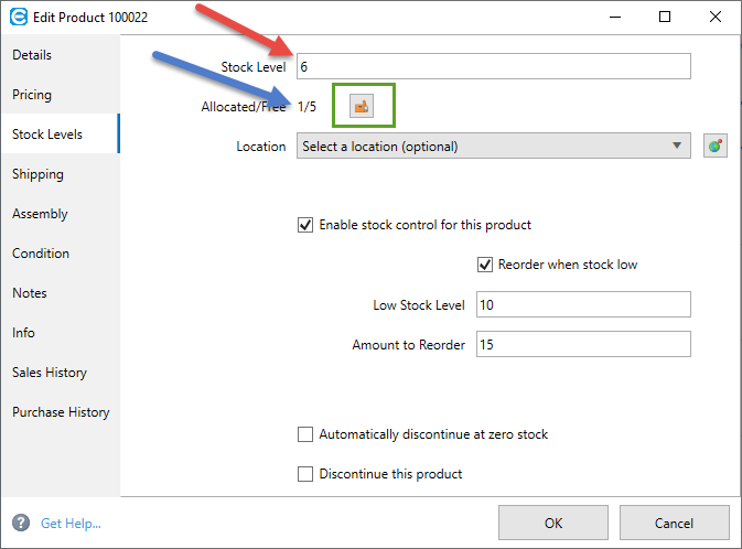 - Then you need to set your 'Low Stock Level' - this is the quantity of items that you wish to ensure you keep in stock at any one time (blue arrow). The amount here will take into account how many items are allocated to orders and only count free items.